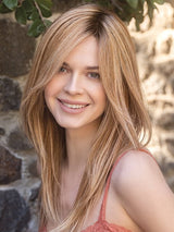 Experience the Amore Collection's Brielle, a luxurious Remy human hair wig featuring a delicate lace front and stunning layers that frame your face. The soft net back, monofilament top, and silicone strips ensure ultimate comfort. Each strand of hair is carefully hand-tied for a lightweight and natural feel.
